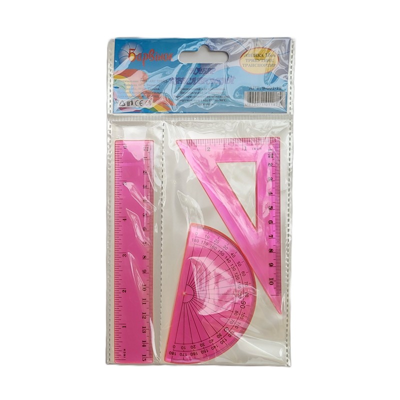9-601-12 БАРВИНОК Набор: линейка 15 см + треугольник + транспортир розовые, пластик