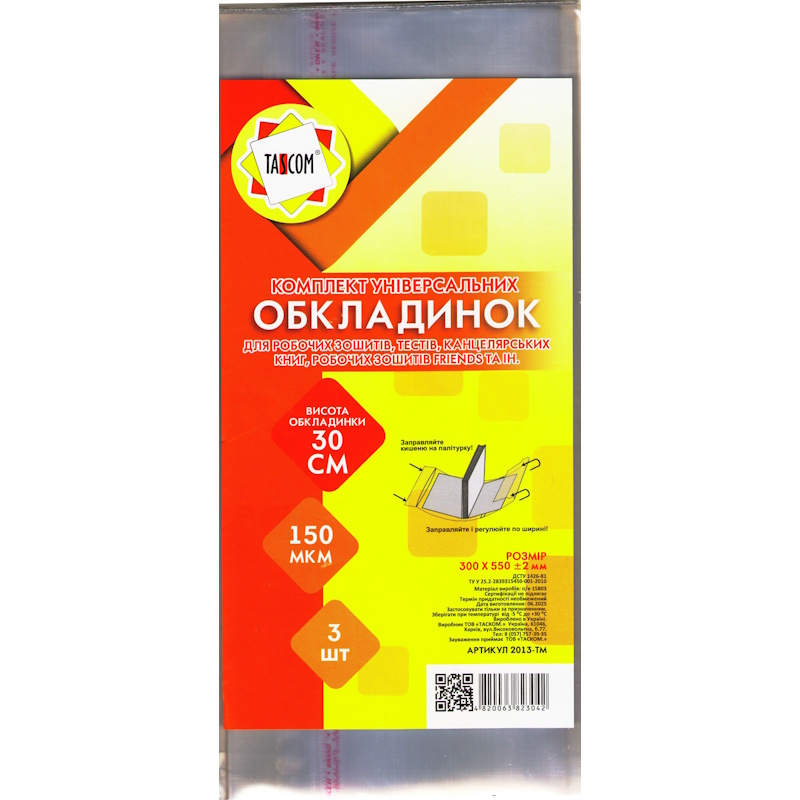 2013-ТМ Комплект регулируемых обложек 3 шт. 300x550 мм для рабочих тетрадей, тестов и канцелярских книг клеевые, п/э 150 мкм, TASCOM