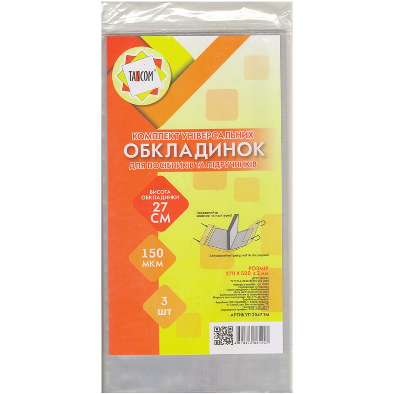 2047-ТМ Комплект регулируемых обложек 3 шт. 270x500 мм для пособий и учебников клеевые, п/э 150 мкм, TASCOM