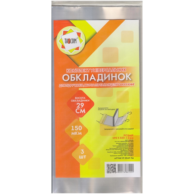2049-ТМ Комплект регулируемых обложек 3 шт. 290x550 мм для журналов и канцелярских книг клеевые, п/э 150 мкм, TASCOM