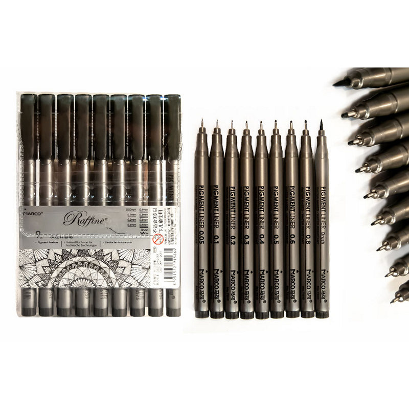 7810-9PB Набор рапидографов 9 шт. (0,05; 0,1; 0,2; 0,3; 0,4; 0,5; 0,6; 0,8; brush) Raffine, Marco